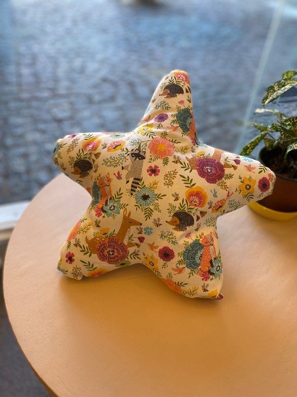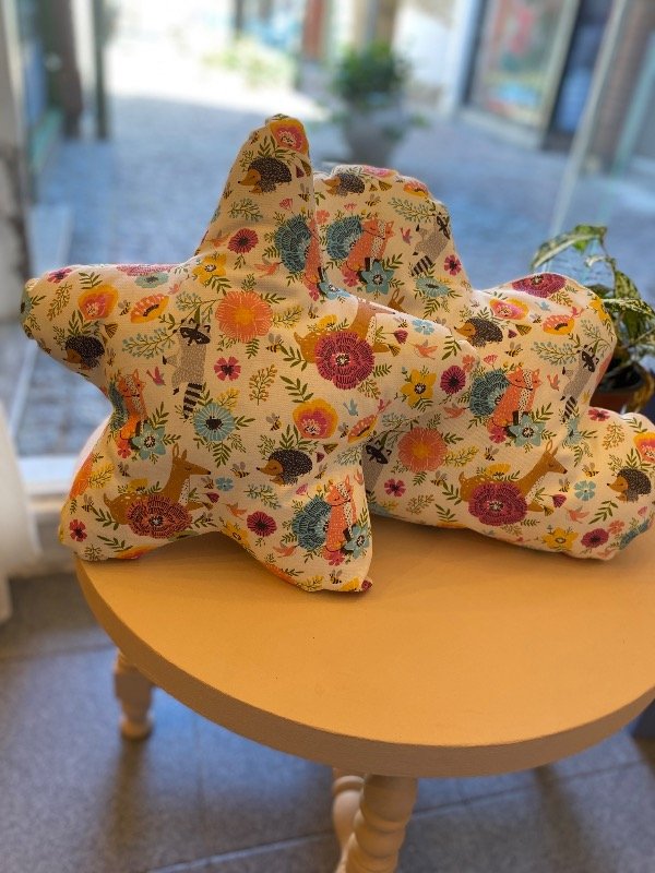 Almohadón con forma de estrella, fueron pensados para decorar habitaciones o espacios de juego y/o lectura de los niños.