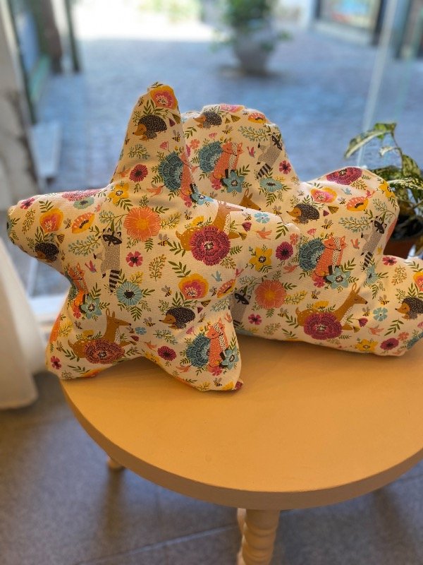 Está confeccionado artesanalmente en tela de algodón, relleno con vellón siliconado que le da volumen y suavidad, ideal para decorar camas, sillones o espacios infantiles.