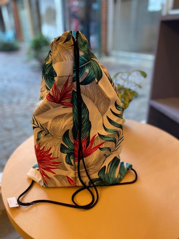 Está confeccionada en telas de algodón y cuenta con un sistema de cierre marinero: las mismas tiras que se utilizan para colgarla permiten ajustar la boca de la mochila, manteniendo su contenido seguro y fácil de abrir.