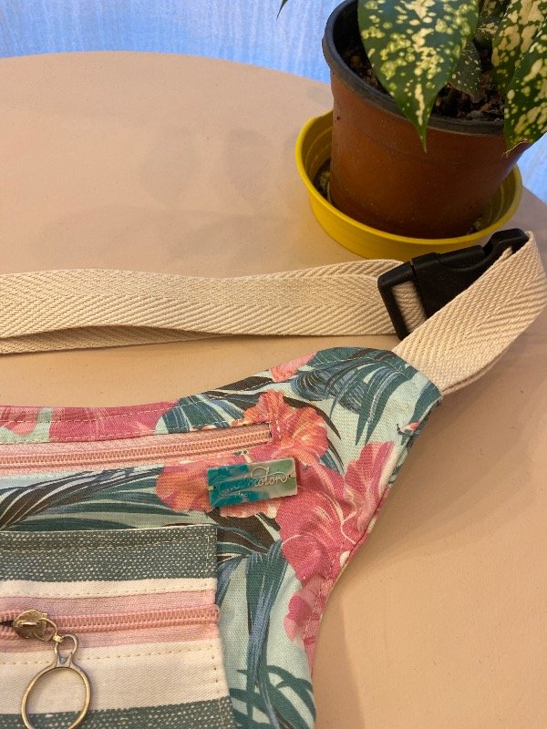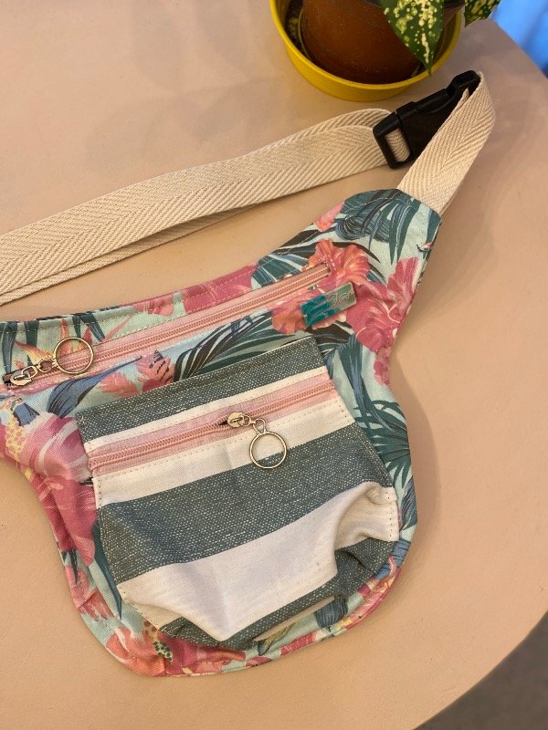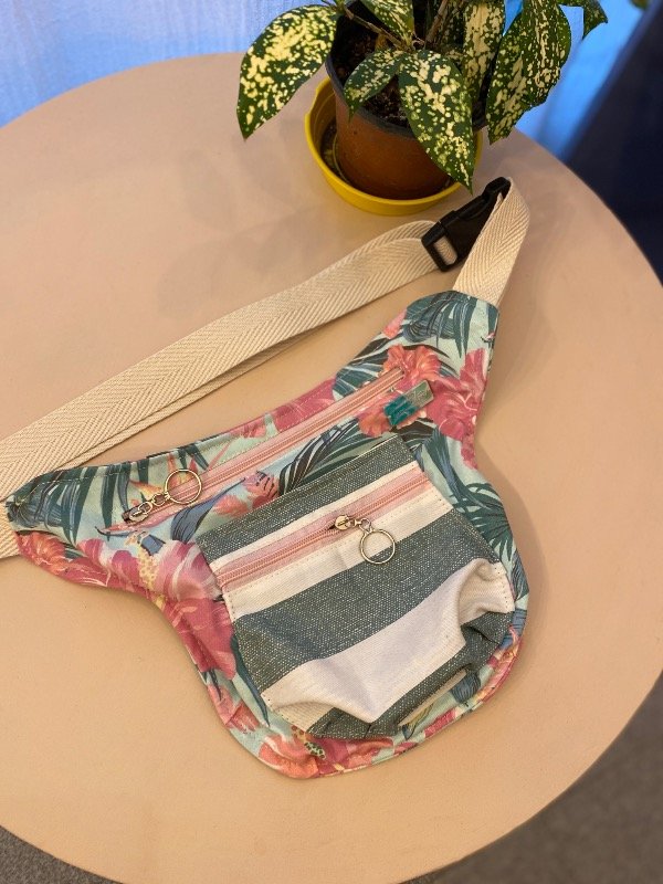Riñonera de tela, con correa regulable y forro interno.