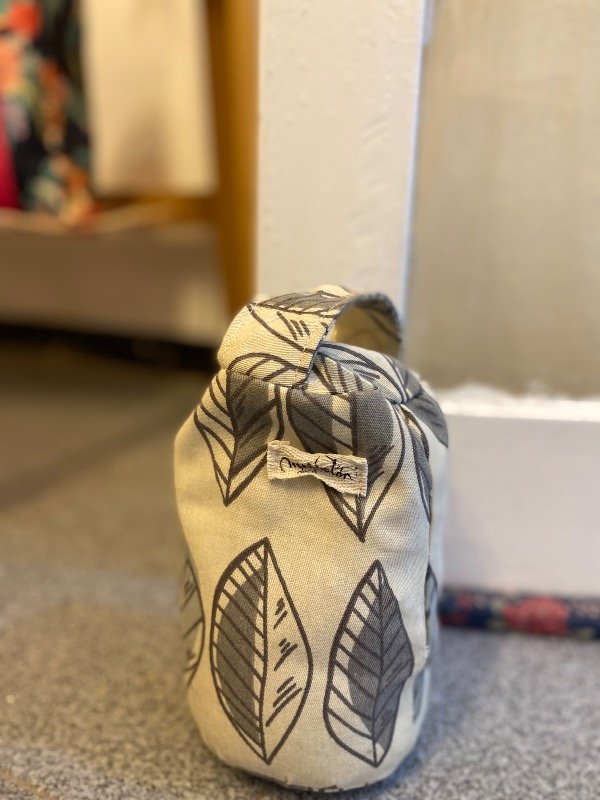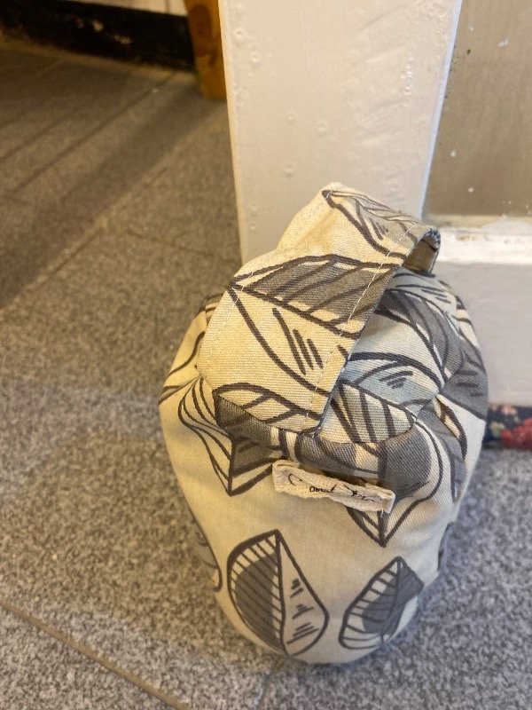 Está confeccionada en tela resistente y rellena con arena, lo que le da el peso justo para sostener la puerta con firmeza sin ocupar demasiado espacio. Su forma cilíndrica permite apoyarla fácilmente contra la puerta y moverla cuando lo necesites.