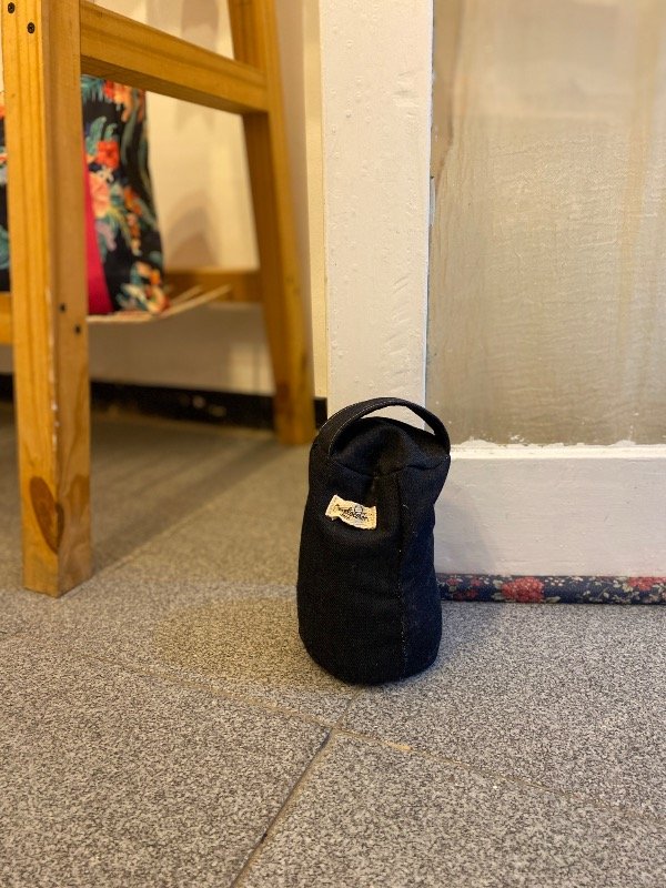 Está confeccionada en tela resistente y rellena con arena, lo que le da el peso justo para sostener la puerta con firmeza sin ocupar demasiado espacio. Su forma cilíndrica permite apoyarla fácilmente contra la puerta y moverla cuando lo necesites.