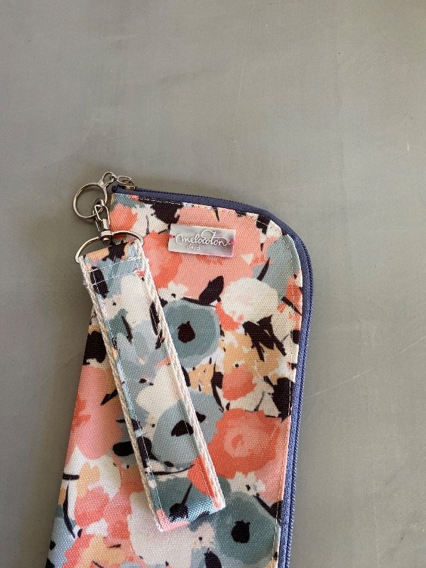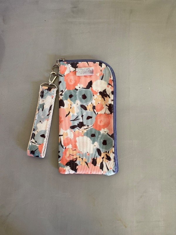 tiene 2 bolsillos, uno con divisiones para tarjetas y documentos y el otro para billetes, dentro entra el celular y tiene una correa para colgar llaves o llevarlo colgado de la muñeca
