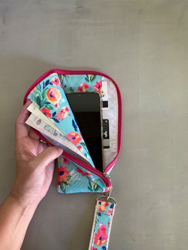 tiene 2 bolsillos, uno con divisiones para tarjetas y documentos y el otro para billetes, dentro entra el celular y tiene una correa para colgar llaves o llevarlo colgado de la muñeca