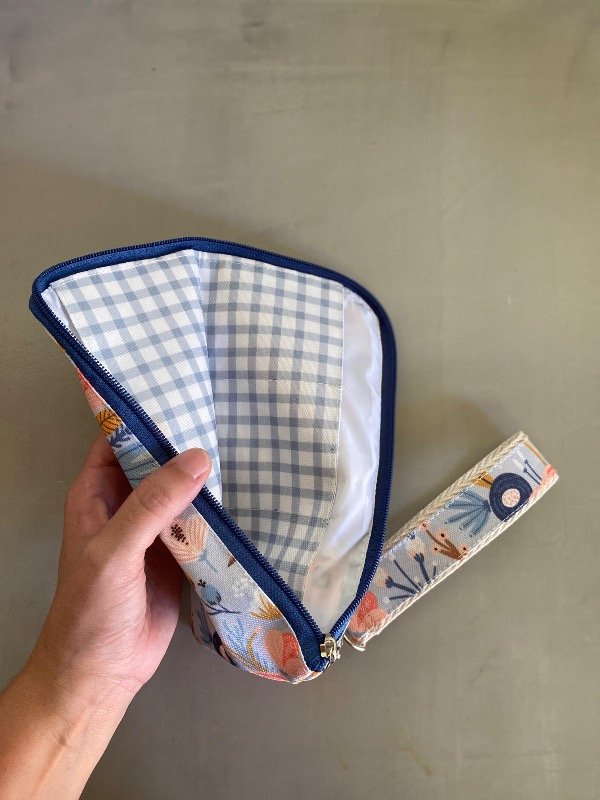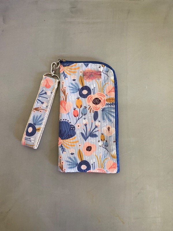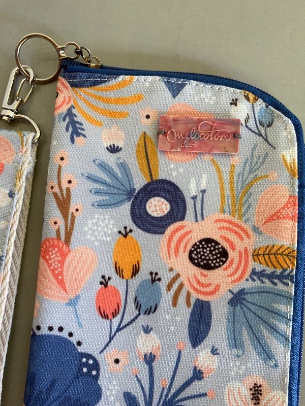 tiene 2 bolsillos, uno con divisiones para tarjetas y documentos y el otro para billetes, dentro entra el celular y tiene una correa para colgar llaves o llevarlo colgado de la muñeca