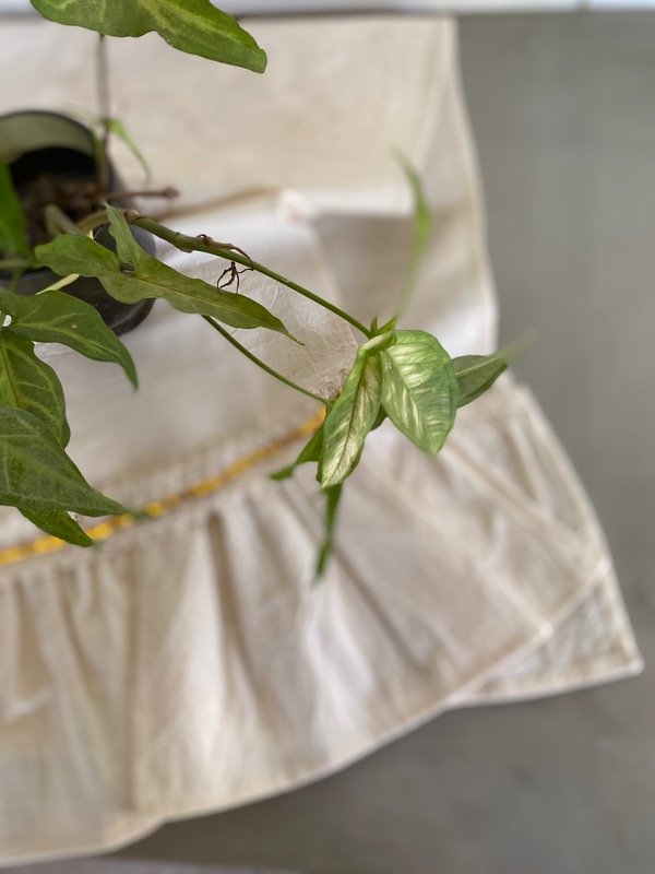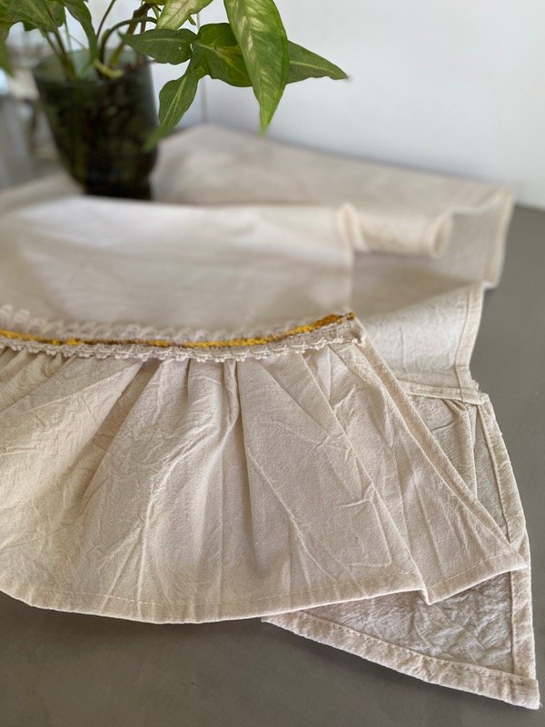 Confeccionado en suave tusor color crudo, este camino de mesa aporta calidez y un aire romántico a cualquier espacio.