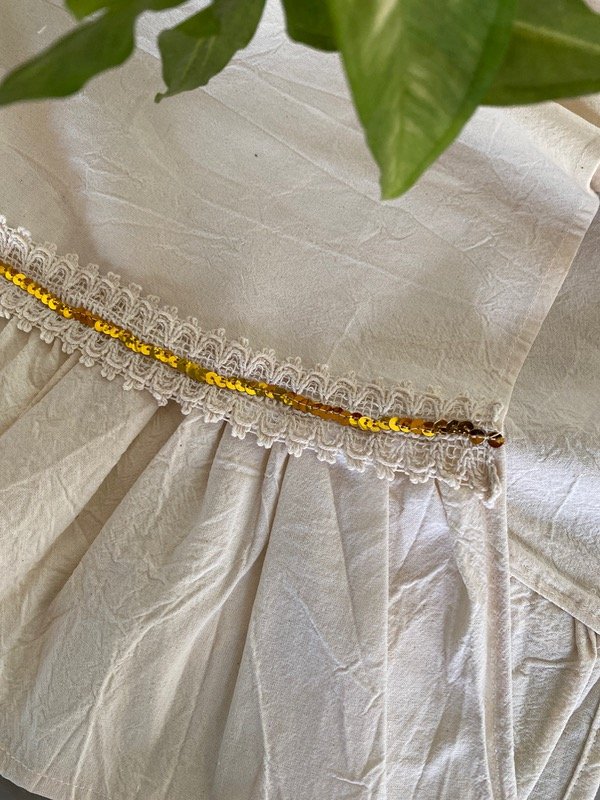 Su diseño combina delicados volados, puntilla y una fina tira de lentejuelas que suman un brillo sutil y elegante.