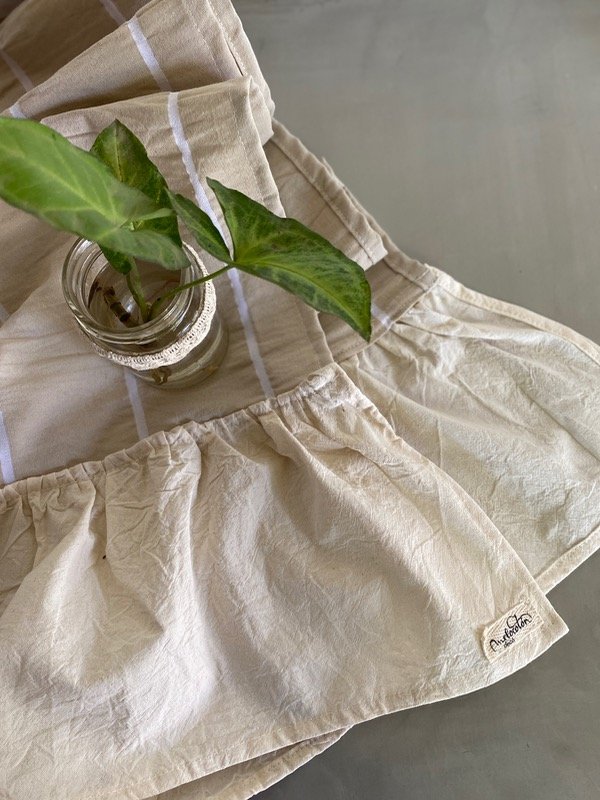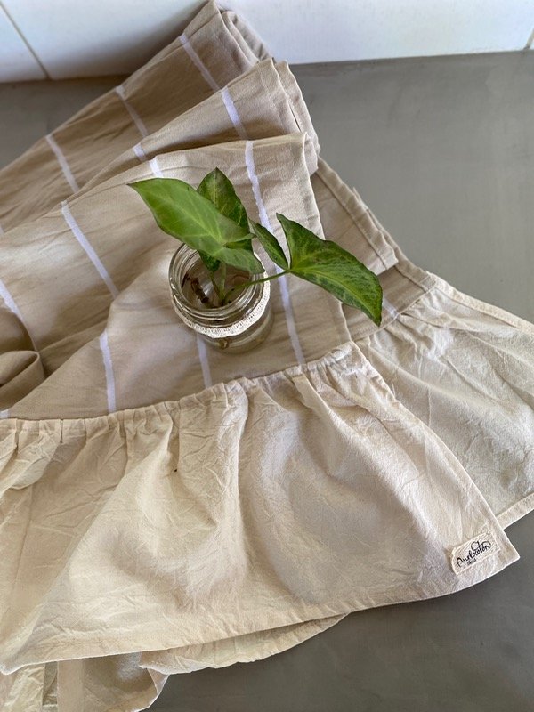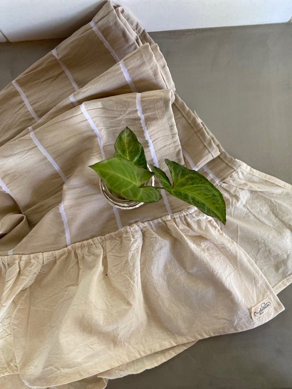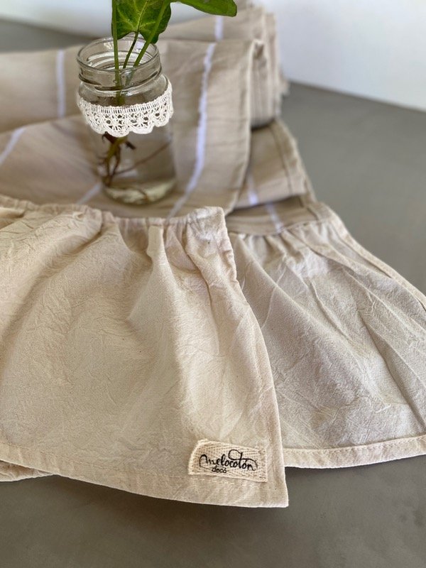 Confeccionado en suave tusor color crudo, este camino de mesa aporta calidez y un aire romántico a cualquier espacio.
